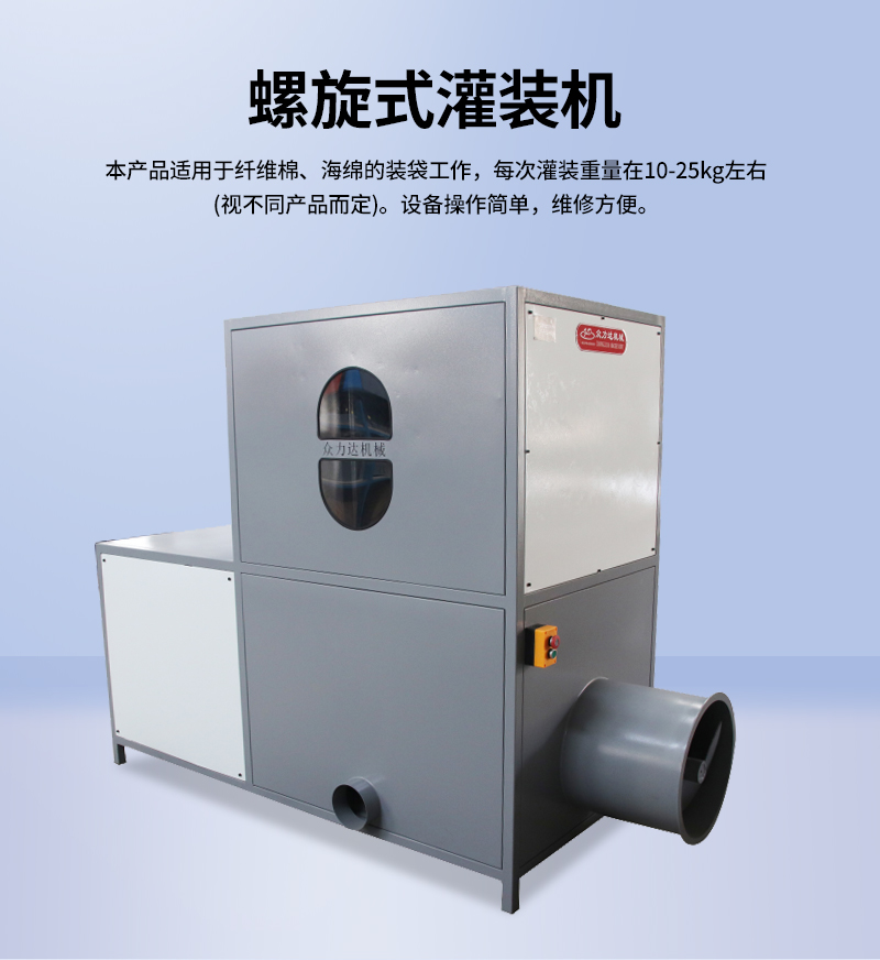 1.灌裝機(jī)適用于纖維棉、海綿的裝袋工作,每次灌裝重量在10-25kg左右(視不同產(chǎn)品而定)。
