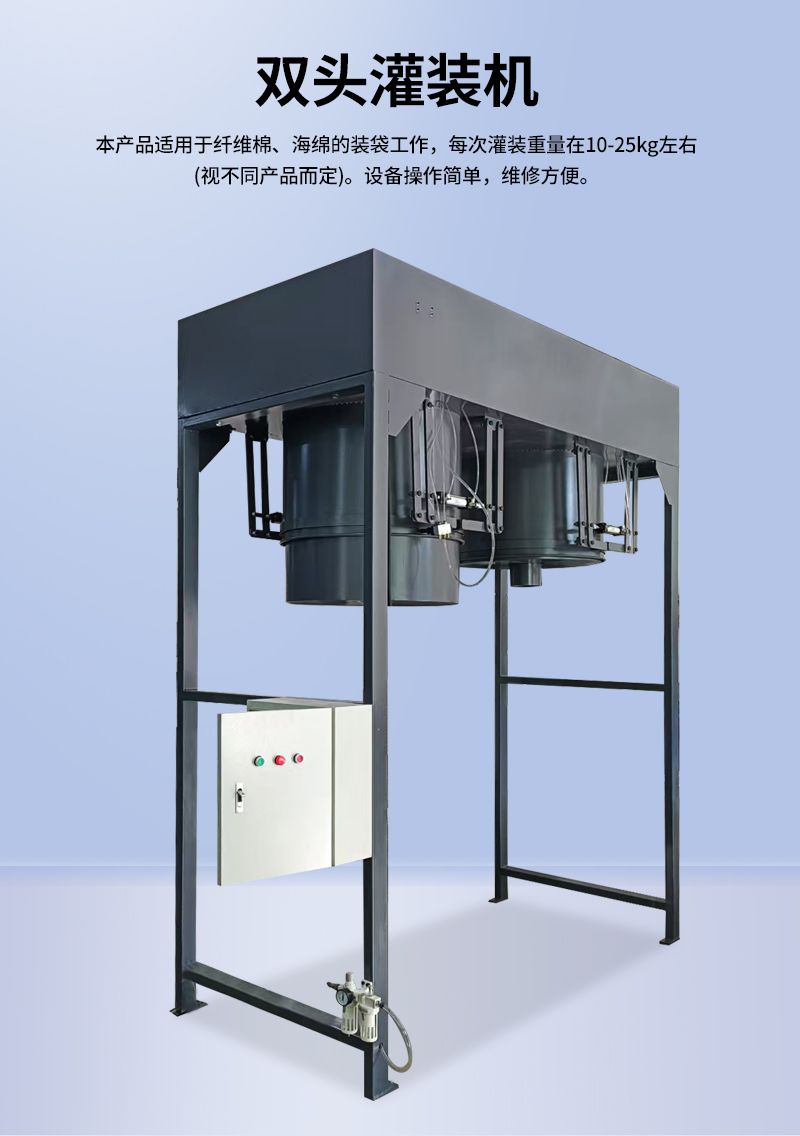 1.灌裝機(jī)適用于纖維棉、海綿的裝袋工作,每次灌裝重量在10-25kg左右(視不同產(chǎn)品而定)。