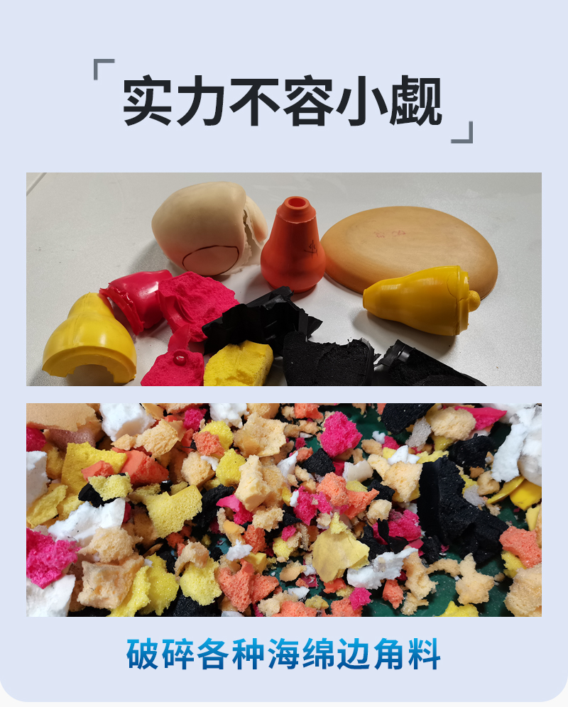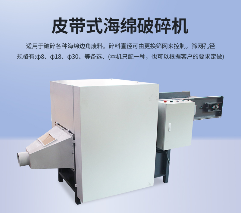 1.適用于破碎各種海綿邊角料,碎料直徑可由更換篩網來控制。篩網孔徑規(guī)格有Φ15,Φ20、Φ25等備選(本機只配一種,也可以根據客戶的要求定做)。