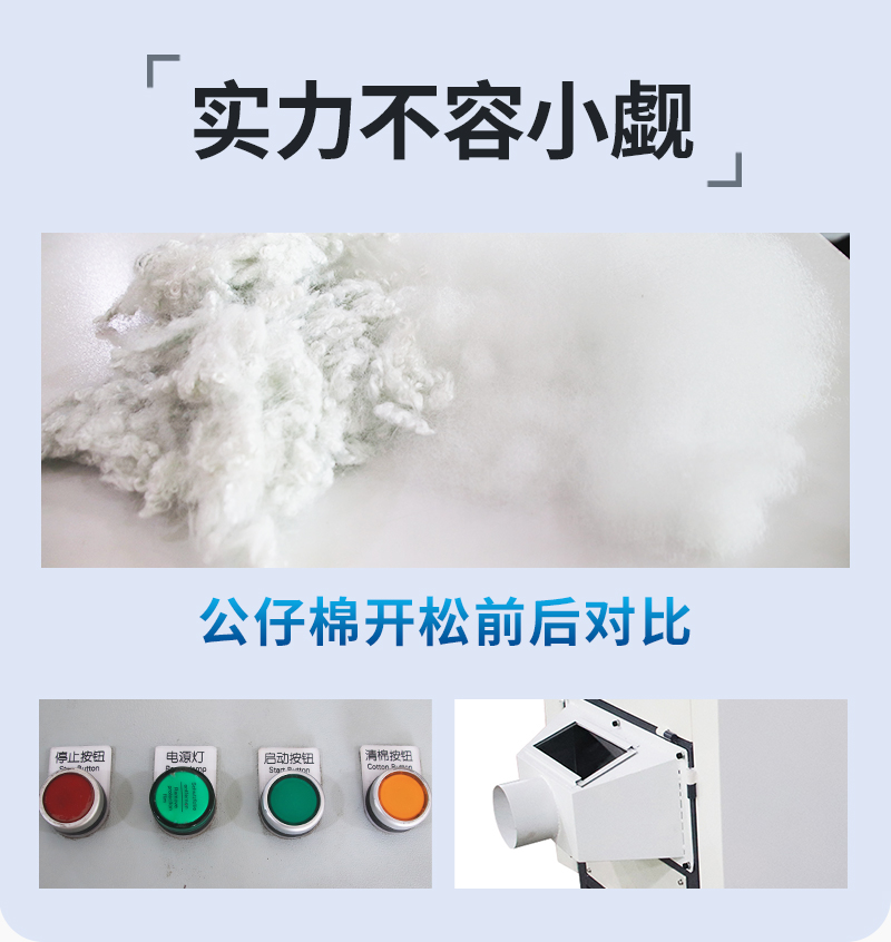 1.公仔棉開松機(jī)又名松棉機(jī),整機(jī)采用全封閉式,外形整齊美觀大方,自帶保護(hù)裝置,操作簡單安全可靠,吊運(yùn)安裝方便。