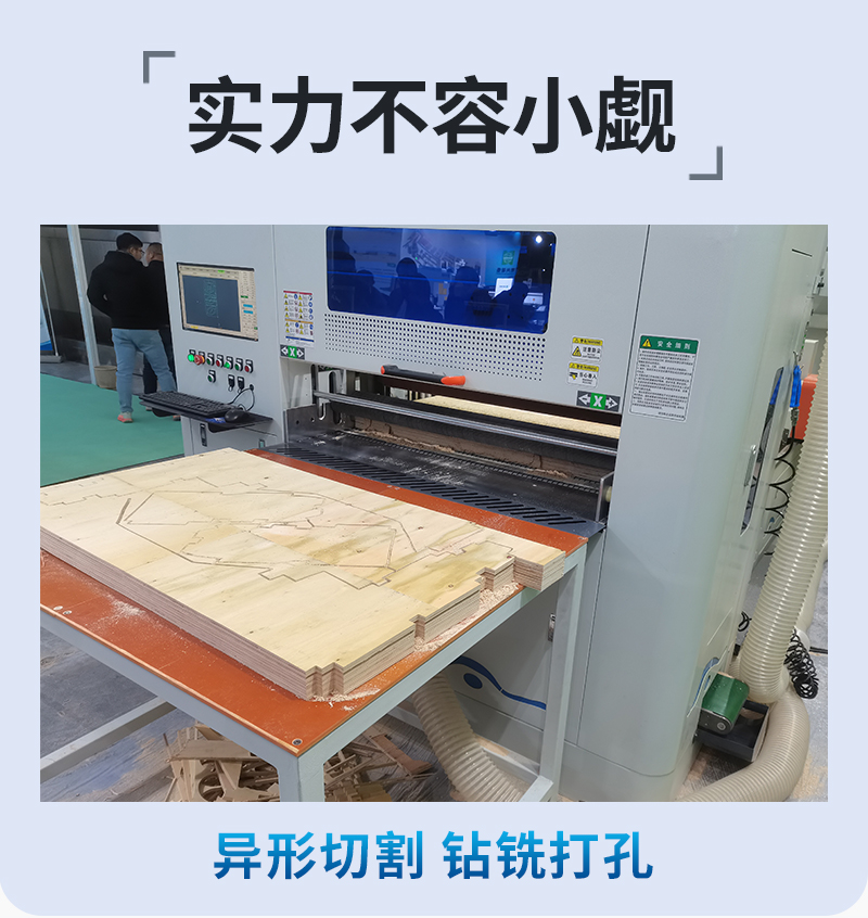 1.鉆銑CNC開料機采用進口高精度伺服電機和驅(qū)動器,確保切割精度達到土0.1mm,配備自動對刀裝置,實現(xiàn)快速精準(zhǔn)對刀,節(jié)省調(diào)機時間。